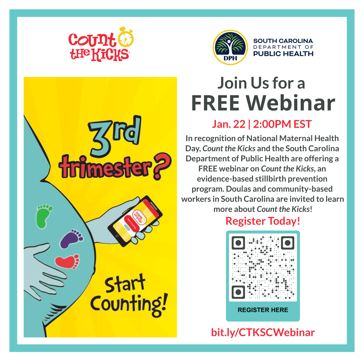 DPH has partnered with Count the Kicks to provide education on tracking fetal movement to prevent stillbirths. They are hosting a free webinar next Thursday in recognition of National Maternal Health Awareness Day. The webinar is focused on how doulas and CHWs can talk to expectant parents about stillbirth prevention. Feel free to share the attached flyer. If you cannot attend at that time, those who are registered will get a recording of the session.