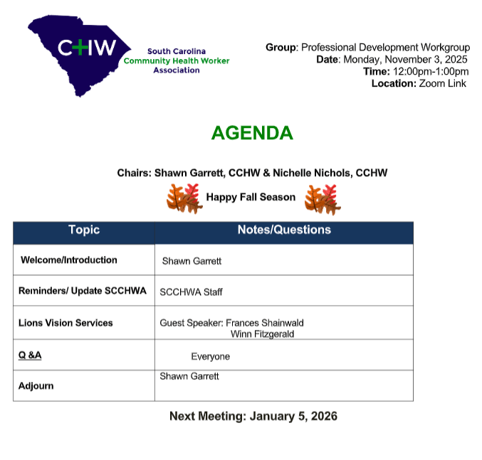 On Monday, November 3, 2025, the Professional Development Workgroup will be joined by representatives from Lions Vision Services to discuss their program and services in South Carolina.
