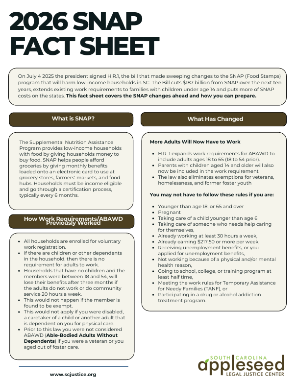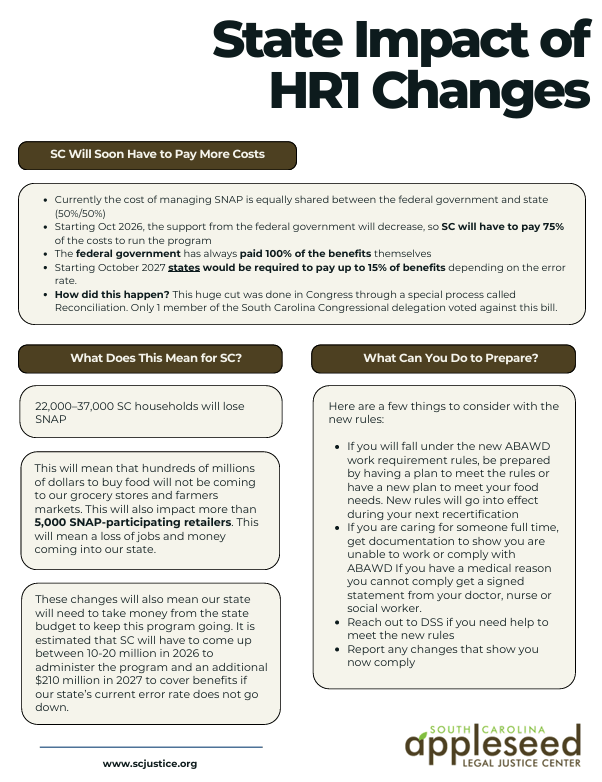 Recently, our team conducted a presentation on the changes to SNAP benefits due to HR1 and other actions this past year from the current administration. We discuss all of the changes and how you can prepare. Below we also have a fact sheet with information from the webinar. Please let us know if you have any questions by emailing info@scjustice.org